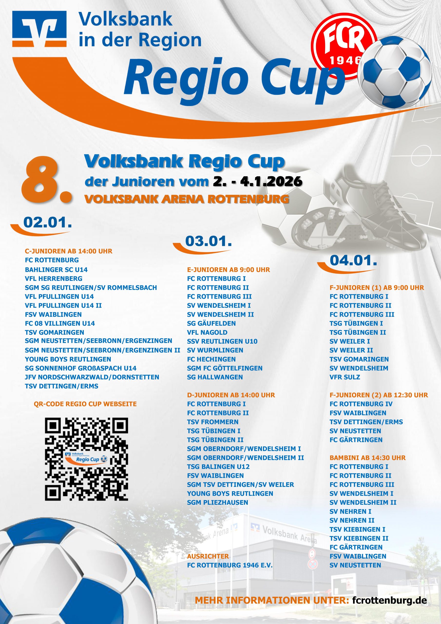 Der Rottenburger Regio Cup der Volksbank geht nun bereits zum achten Mal als verbindendes Element im Sport und im Jugendfußball an den Start. So geht es für die C-, D- und E-Junioren nur 3 Tage später nach dem Hallen-Budenzauber – dem Rottenburger Stadtpokal – auch im Jahr 2026 gleich weiter mit Fußball Total. Der FC Rottenburg veranstaltet wie gewohnt am ersten Kalenderwochenende vom 2. bis 4.1.2026 nun seinen 8. Volksbank Regio Cup in der Volksbank Arena in Rottenburg – wieder mit der beliebten Rundumbande. Mit dabei auch wieder die Bambini und F-Junioren, die beim beliebten Traditionsturnier – dem Nachfolger der Rottenburger Jugendturniere des FCR – ohne Wertung, dafür mit „Erlebnis statt Ergebnis“ mitspielen.