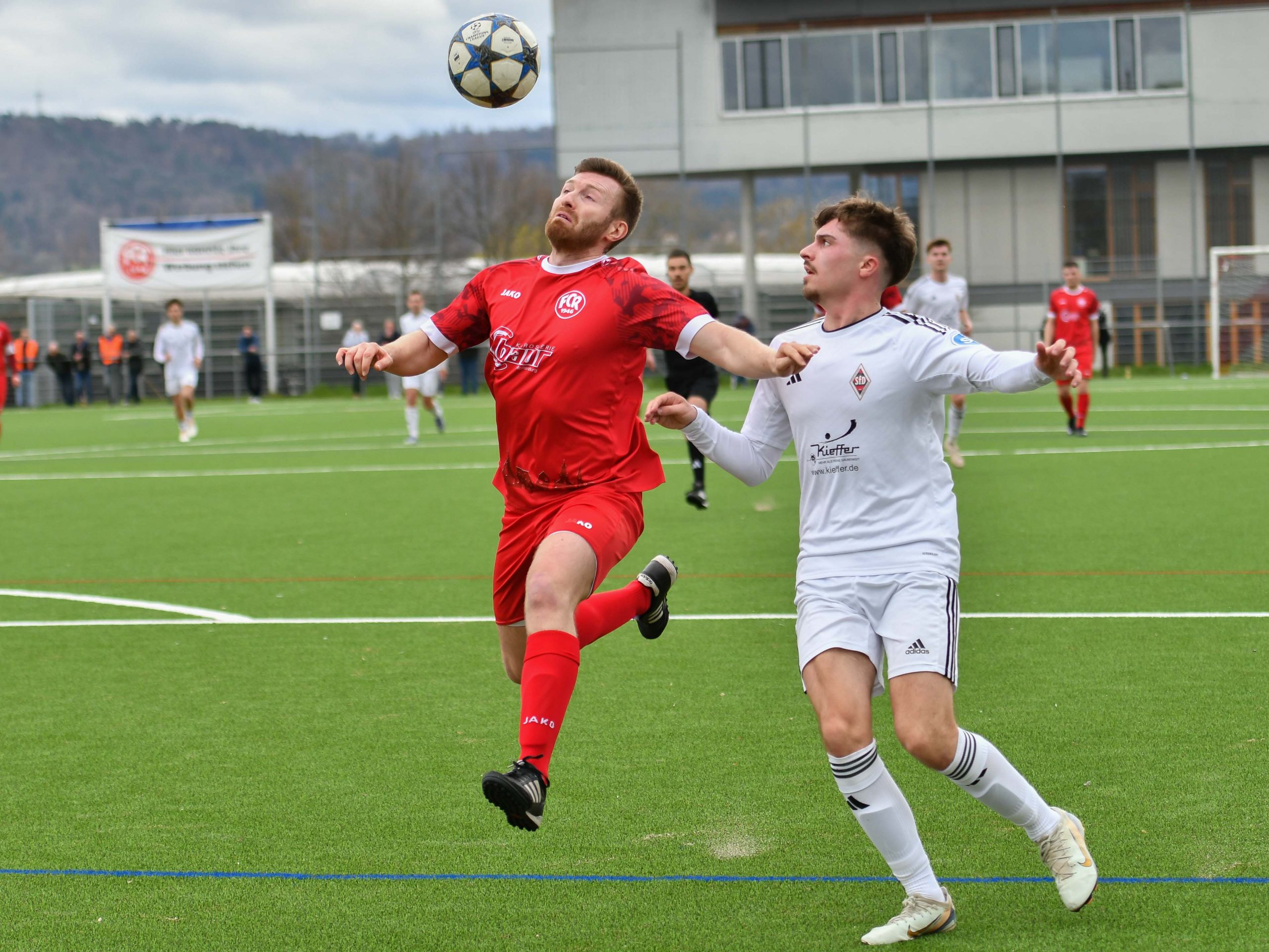 Nach etwa 20 Minuten mit mehr Ballbesitz und guten Chancen meldeten sich die SF zurück und registrierten in der 28. Minute ihren ersten erwähnenswerten Torschuss. Doch bereits in der Folgezeit zeigte der FCR wieder Präsenz und kam in der 33. sowie 42. Minute zu zwei hervorragenden Möglichkeiten: Erst verfehlte Behr mit einem frechen Lupfer, der zur Ecke abgefälscht wurde, nur knapp sein Ziel. Wenig später nutzte er eine Gelegenheit, als der 40-jährige SF-Keeper Christian Zech zu weit vor seinem Tor stand. Behr versuchte aus gut 25 Metern das leere Gehäuse zu treffen, doch der Ball ging knapp vorbei, da er sich schnell entscheiden musste. Nach einer Minute Nachspielzeit beendete Schiedsrichter Daniel Buck von der SRG Böblingen eine spannende erste Hälfte, in der der FCR aufgrund der Spielanteile leichte Vorteile hatte. Für die Roten gegen die in Weiß spielenden Ostälbler sieht die Ausgangslage somit vielversprechend aus.