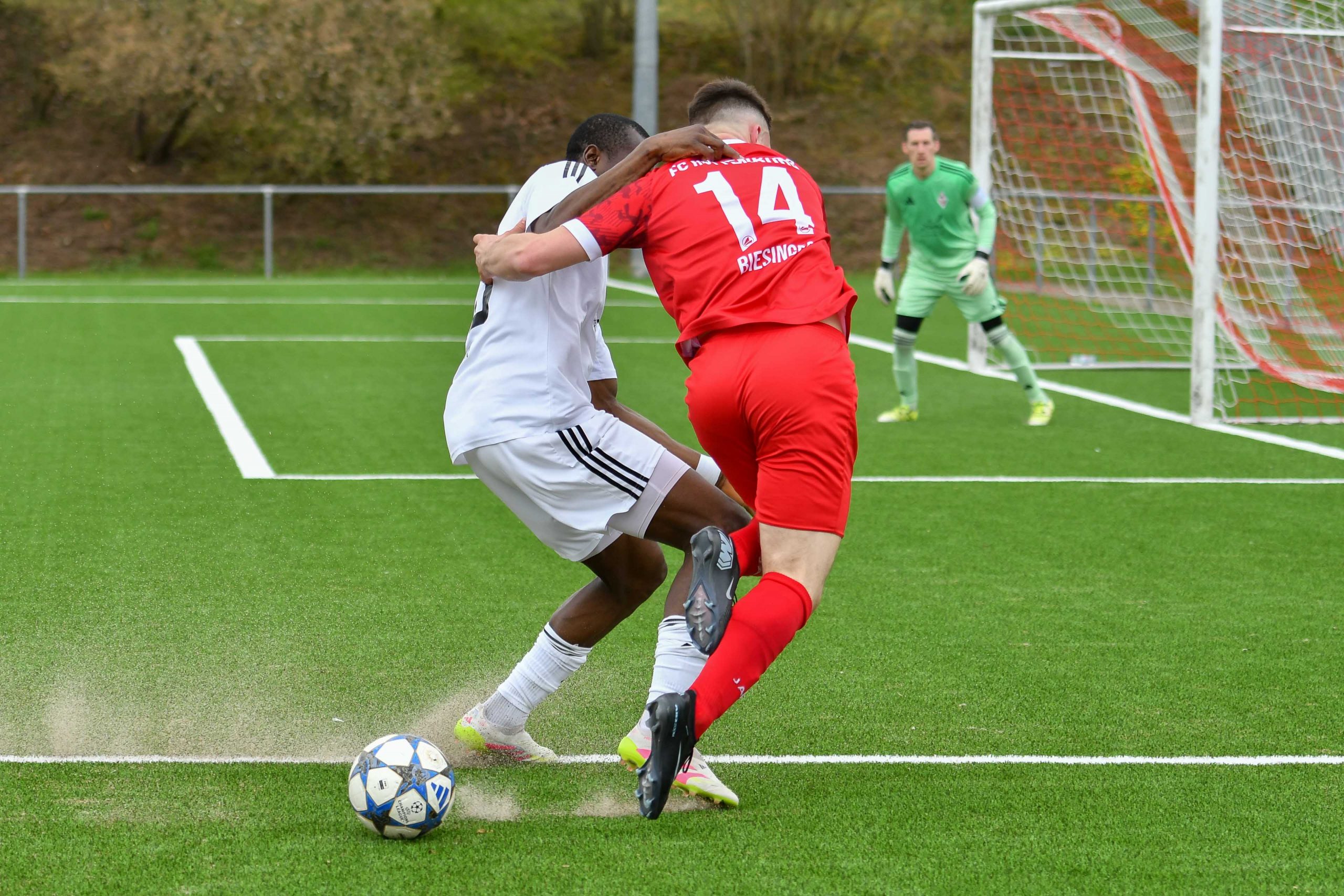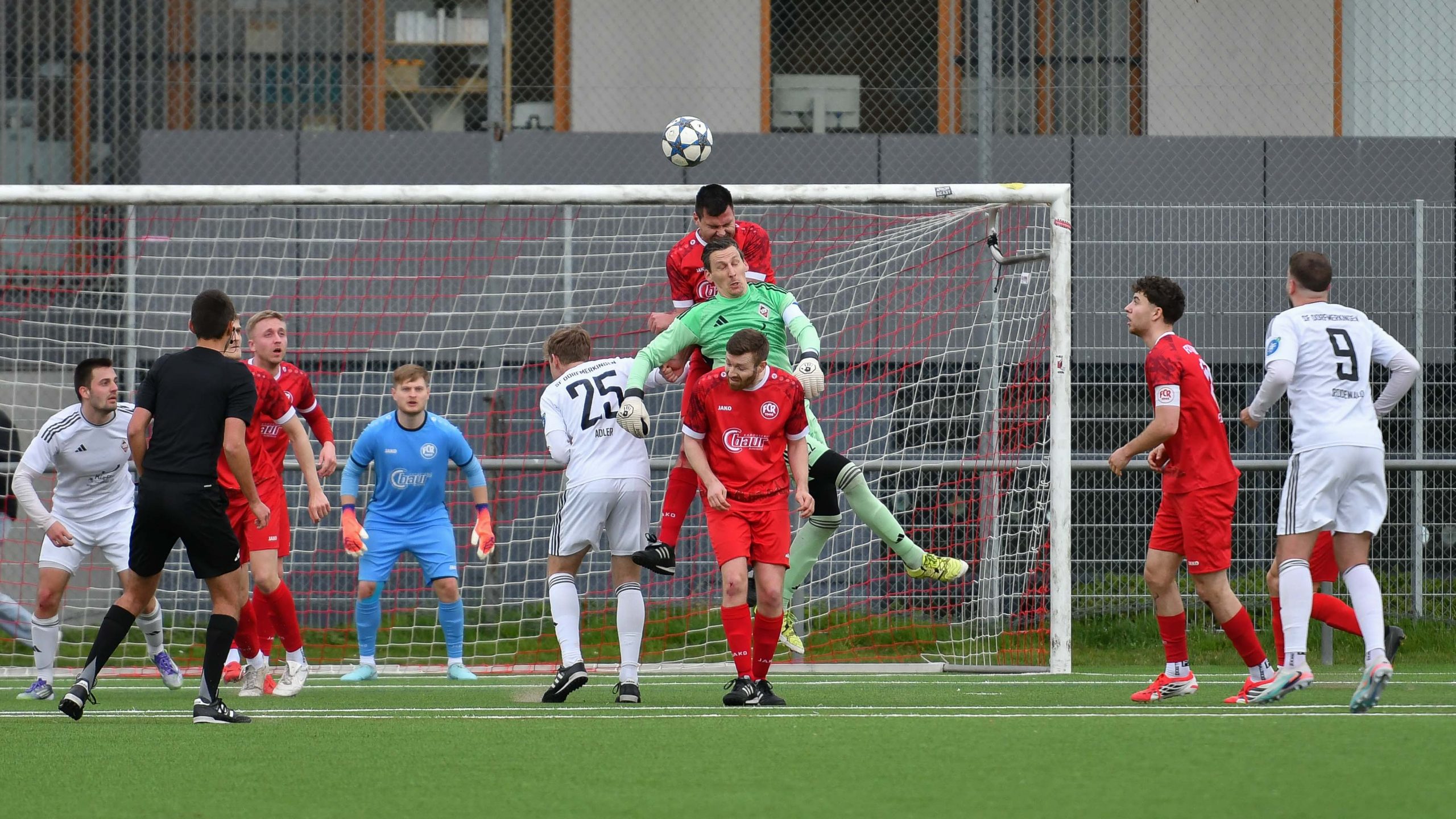 Das Spiel entwickelte sich daraufhin zu einem temporeichen und intensiven Duell, geprägt von zahlreichen Zweikämpfen und spielstarken Sportfreunden. Der FCR erwies sich als äußerst robust und erinnerte an seine starke Leistung in der zweiten Hälfte in Tübingen, sodass er den eigenen Kasten bis dato sauber hielt. Die nächste vielversprechende Aktion in der 17. Minute resultierte erneut aus einer Ecke, bei der Behr vom Torwart gestoppt wurde. Kurz darauf, in der 18. Minute, folgten nach einer weiteren Leyhr-Ecke zwei Großchancen für den FCR – unter anderem durch den bärenstarken Ali Hamdar. Anschließend setzte Hamdar Maxi Biesinger gekonnt in Szene, doch dessen Direktabnahme wurde vom Dorfmerkinger Torhüter und Kapitän glänzend pariert.