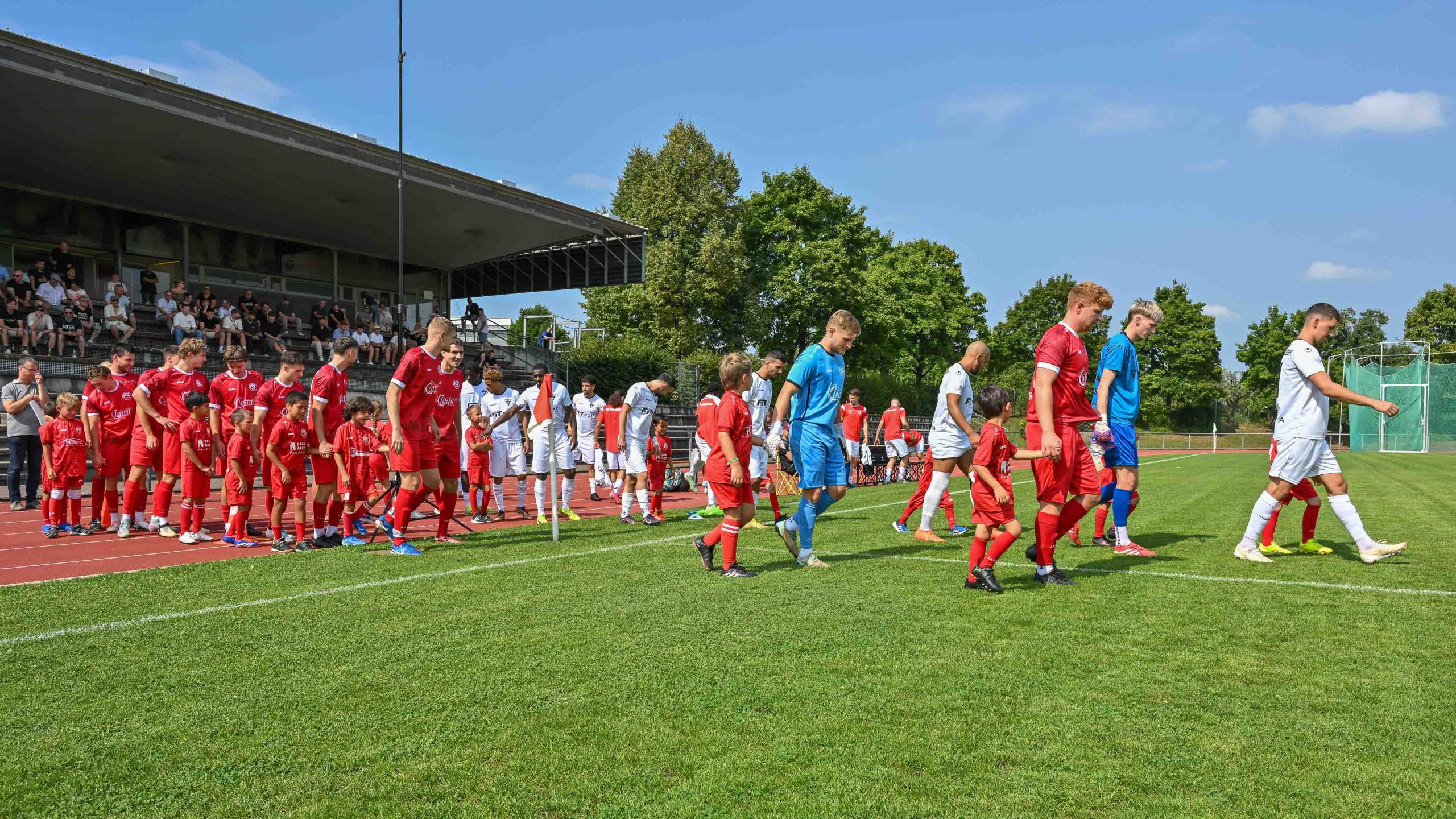 Ein Tag, an dem sich alle FC´ler die dabei waren immer erinnern werden. Am 16.08.2025 bestritt der FCR – hier in Rot mit Einlaufkinder beim Einmarschieren ins Stadion – sein erstes Heimspiel in der Verbandsliga überhaupt. Ein weiterer Moment mit Geschichte. Selbst OB Stephan Neher (ganz links) wollte sich diesen Augenblick nicht nehmen lassen.
